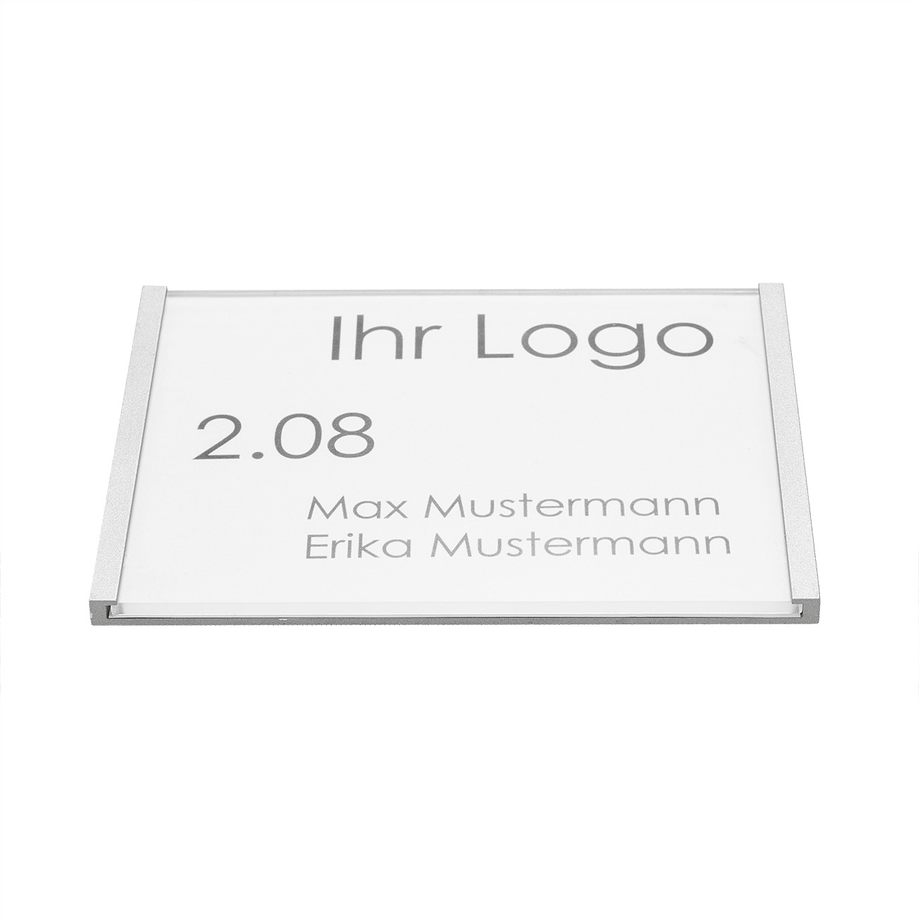 Das Türschild unserer Techno Line 120 überzeugt durch ein hochwertiges und schlichtes Design sowie einer einfachen Handhabung. Das Schild wird wandnah befestigt. Die dafür nötigen Schrauben und Dübel liefern wir natürlich inklusiv mit. Das Türschild besteht aus einem Aluminiumrahmen und einer Acrylglasscheibe. Diese ist antireflektierend beschichtet, somit sind die Informationen auf dem Schild auch bei Lichteinfall gut lesbar.