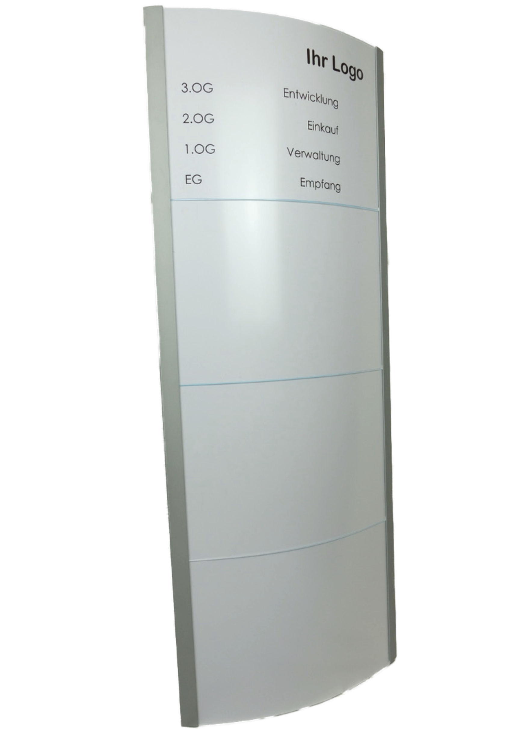 Der Unterwegweiser unserer Techno-Line 100 überzeugt durch eine einfache Handhabung und sein schlichtes Design. Er verschafft Ihren Besuchern, Gästen oder Kunden einen Überblick über die Stockwerke und Räume. Der Wegweiser hat eine konvexe Form und besteht aus Aluminium und Acrylglas. Das Acrylglas ist antireflexbeschichtet, somit sind die Informationen auch bei Lichteinfall gut lesbar. Ob für Ihre Praxis, Ihr Büro oder für Verwaltungsgebäude, mit dieser Beschilderung liegen Sie richtig!