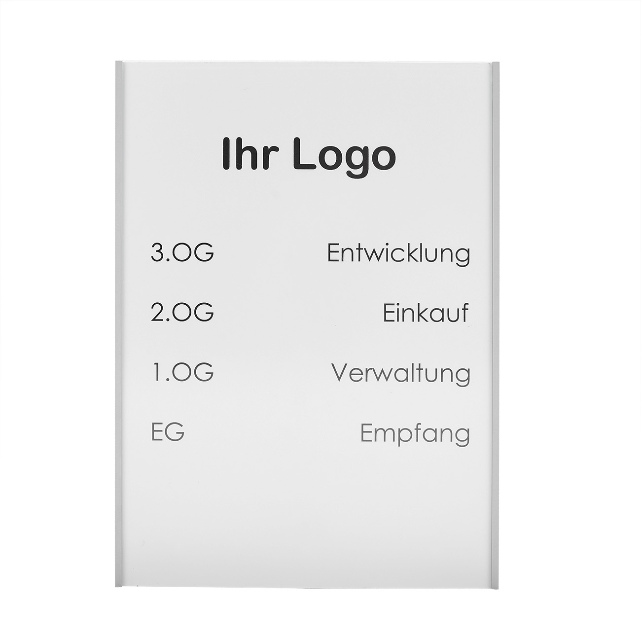 Der Unterwegweiser unserer Techno-Line 120 überzeugt durch eine einfache Handhabung und sein hochwertiges Design. Er verschafft Ihren Besuchern, Gästen und Kunden einen Überblick über die Stockwerke und Räume. Der Wegweiser wird wand-nah angebracht und besteht aus Aluminium und Acrylglas. Das Acrylglas ist antireflexbeschichtet, somit sind die Informationen auch bei Lichteinfall gut lesbar. Ob für Ihre Praxis, Ihr Büro oder für Verwaltungsgebäude, mit dieser Beschilderung liegen sie richtig!